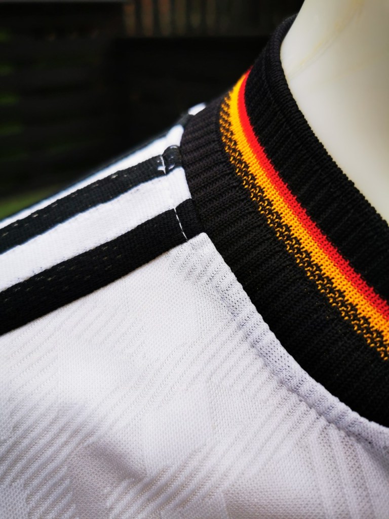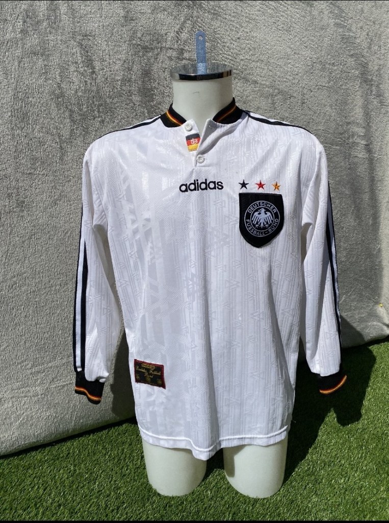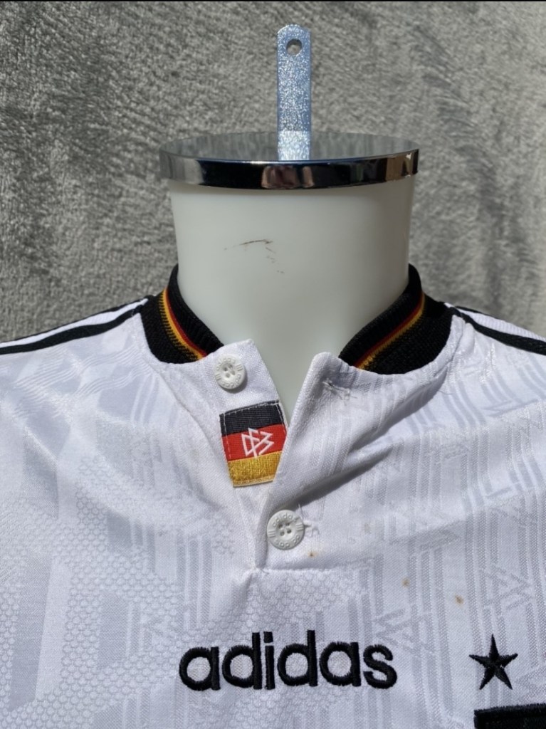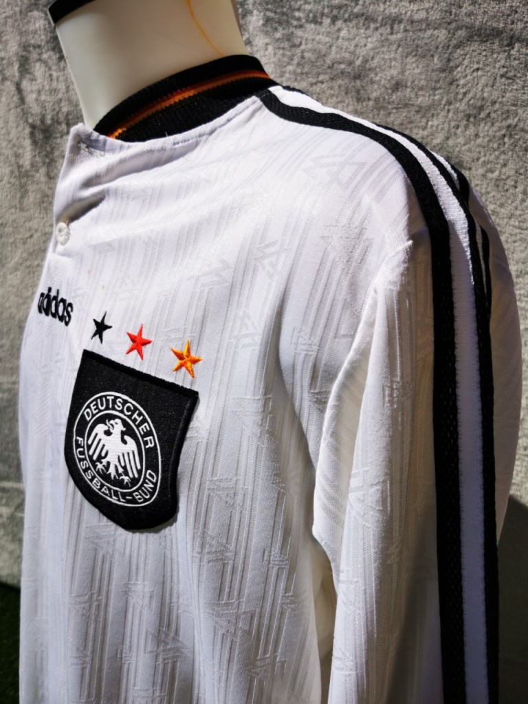 Euro 96 would be where this Germany home top would be showcased in front of the world. This top has so much detail throughout it, showing off different sizes of the German Football Association logo in vertical stripes. The collar, cuffs and stars above the badge are all in the colours of the Germany flag with a small flag in between in buttons of the shirt. The shirt would not be complete if it were not for the iconic adidas stripes running down each sleeve with the black stripes contrasting along the white shirt. The number seven is not featured on the front of this jersey as this top was used in a German friendly rather than a major tournament as shown in the the photos above.