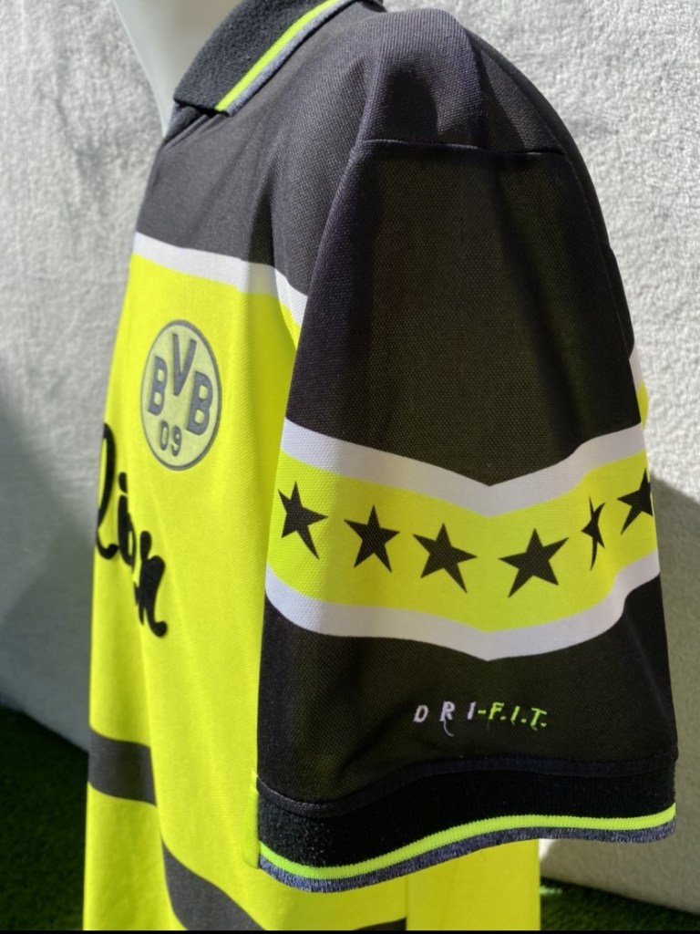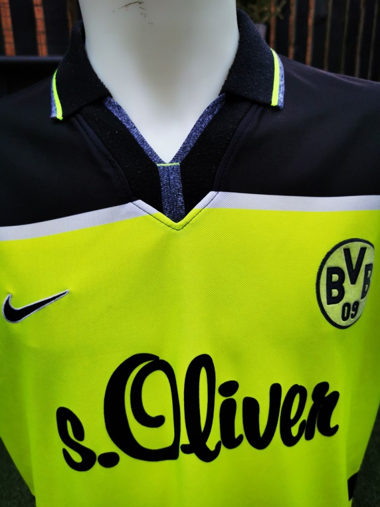 While that season may not have been a success for Borussia Dortmund, this jersey is a masterstroke from Nike, mainly due to the yellow and black that makesthis Dortmund kit so instantly recognisable but also from just how simple the kit is. Mainly down to the thin white stripe under the collar neatly separating the black and bold yellow. The black, yellow and grey trim around the collar is also copied around both sleeves with the same grey at the front of the neck forming a ‘Y’ shape keeping everything coordinated and overall a beautiful kit with a beautiful history.