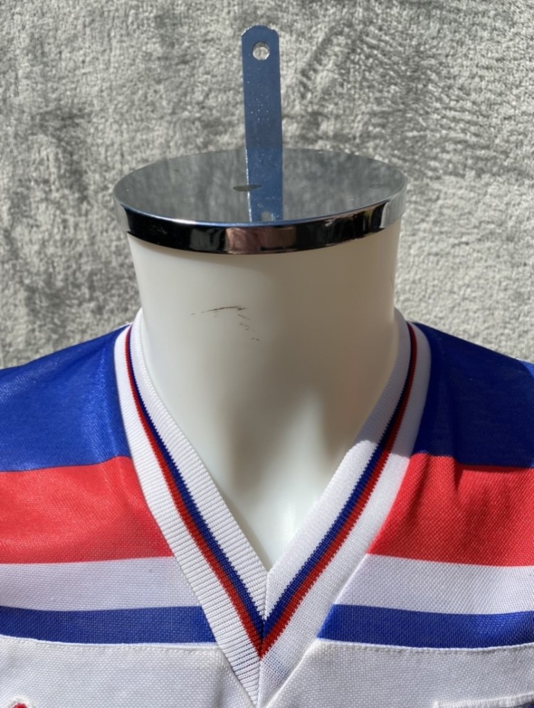 Admiral uses England’s iconic blue and red on a plain white jersey using varying sizes of the stripes on the shoulders. The collar and cuffs follow this same colour scheme but uses much thinner stripes. The large red number stitched on to the back takes up a lot of space. Names were not used regularly on the back of English jerseys until the 1992 European Championships. When you think of England and football this is one of the iconic kits that should come straight to mind.