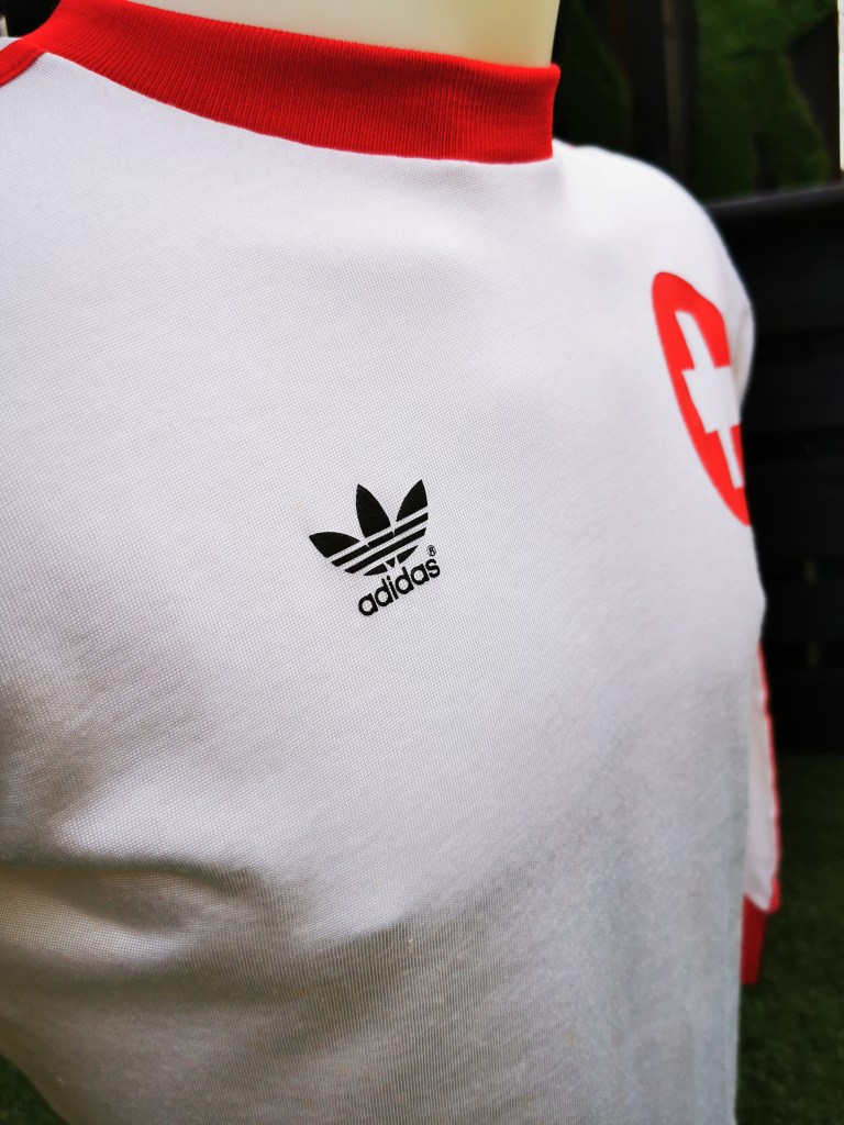 This Adidas classic is similar to many from around that time with a simple two colour combination with one being the main body, white, and the other being used for the collar and Adidas stripes, red. The colours used being from the Swiss flag as shown as the badge.