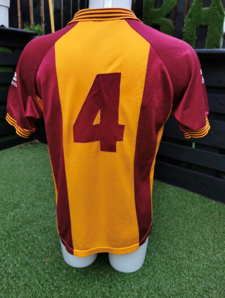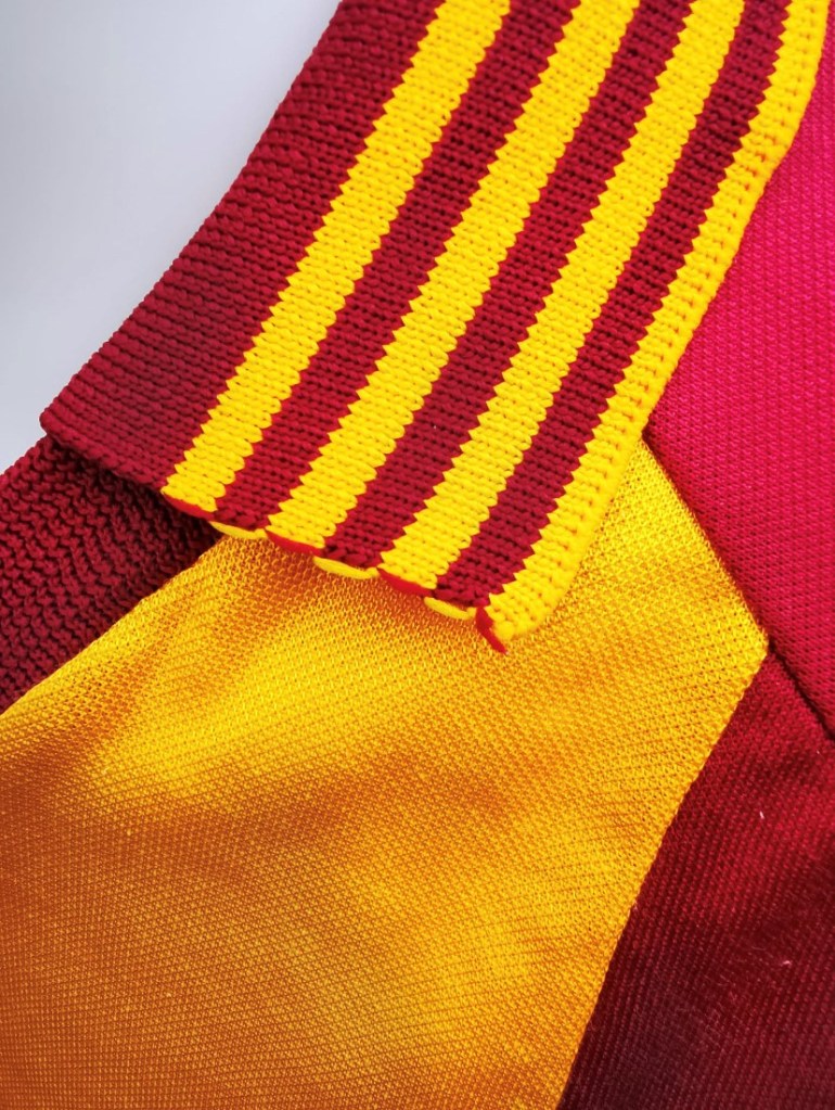 The collar on this top is very 1980’s as it is overly large while using a deep V-neck and using horizontal amber stripes against the claret of the kit. There isn’t too much to say about the kit other than the thick block amber in the middle surrounded by claret with the amber stripe running down the side of the top.