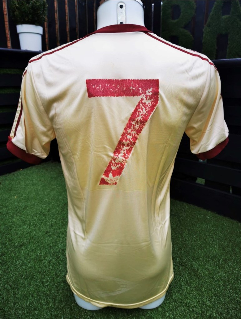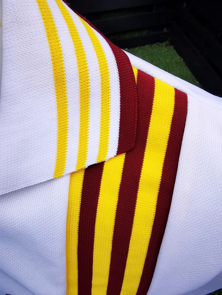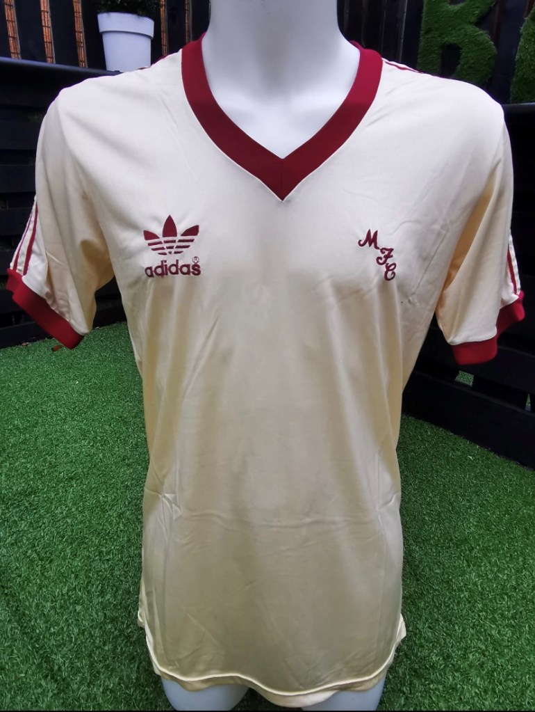 The first time this top was ever worn was in the Scottish Cup Semi Final against Rangers in 1976 where Motherwell would go 2-0 up after an hour into the game before crumbling to the Gers and losing 3-2 with the last coming in the 85th minute. Joe Wark and Willie Pettigrew both played with the latter scoring Motherwell’s second that night.