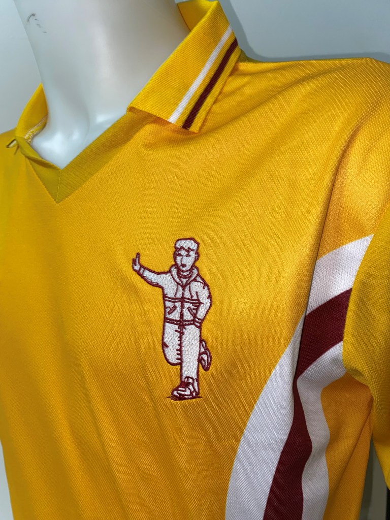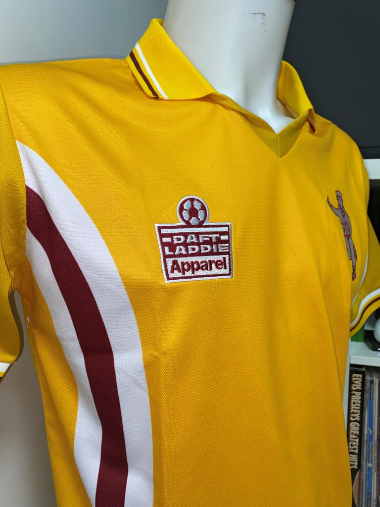 However it’s not just the book we’re covering today as we have been so kindly been given some Daft Laddie merch to coincide with the launch of the book. A take on the classic Admiral Welsh kit of 76′ that features the two stripes arching around with claret and white replacing the green and yellow of the original. It wouldn’t be complete without the Daft Laddie logo and Daft Laddie Apparel badge.