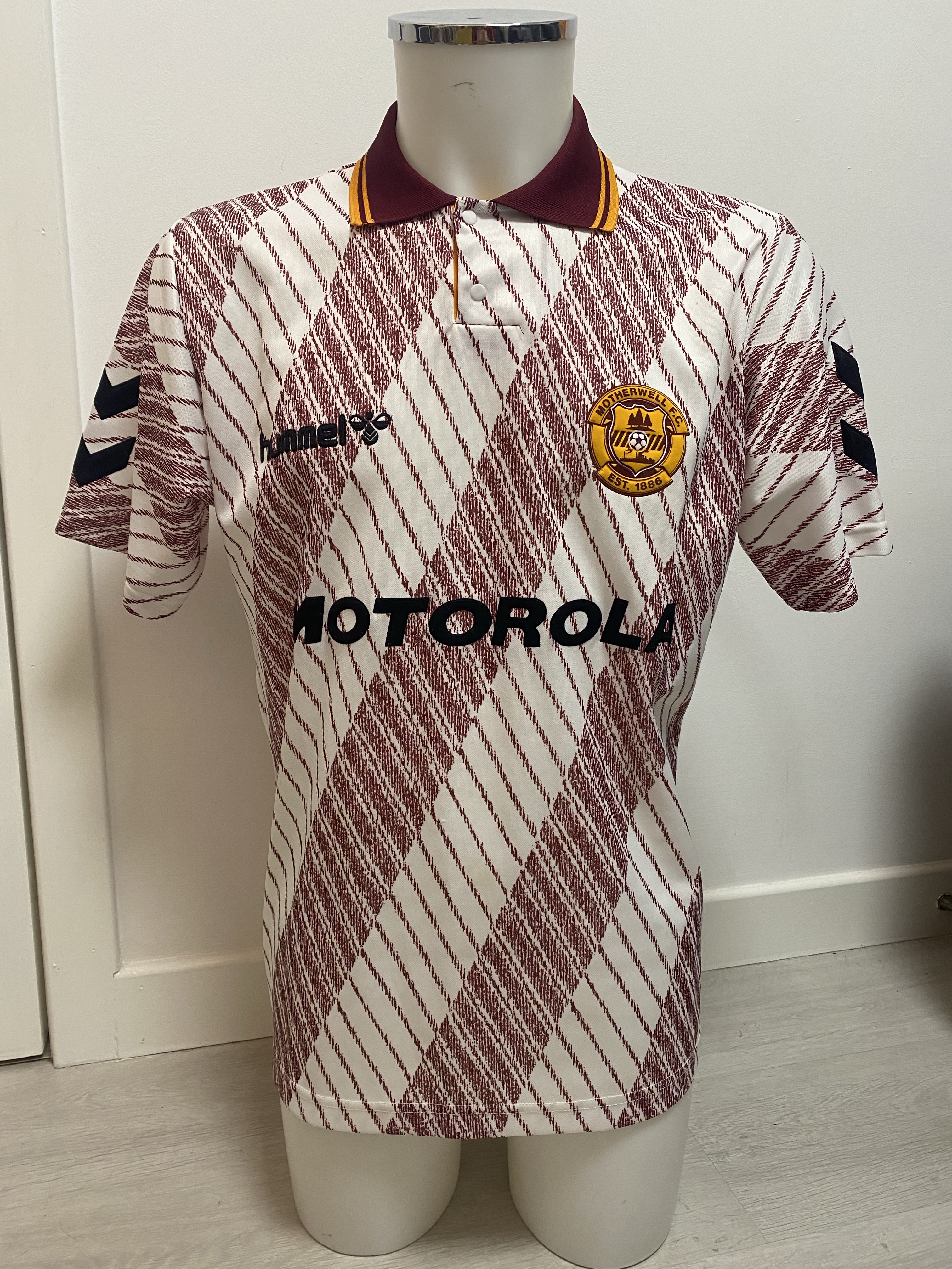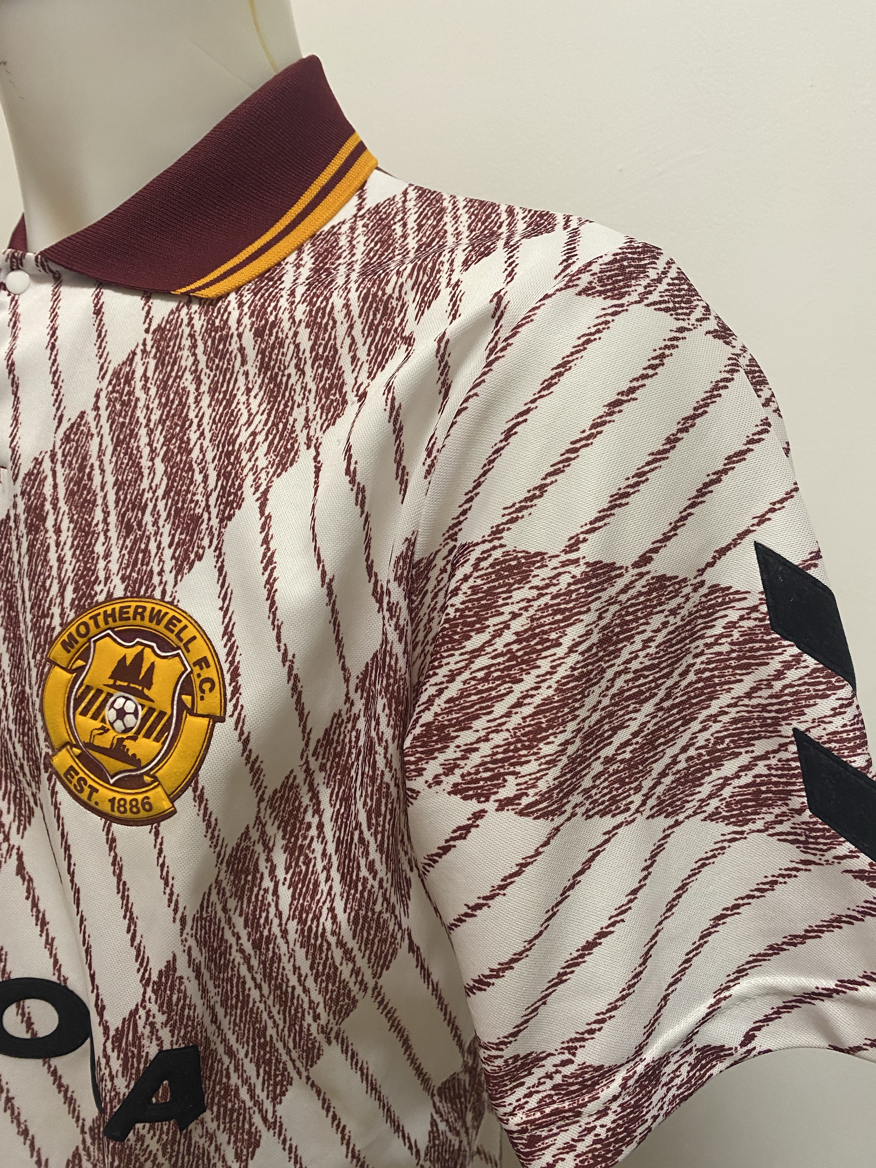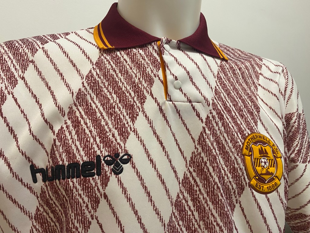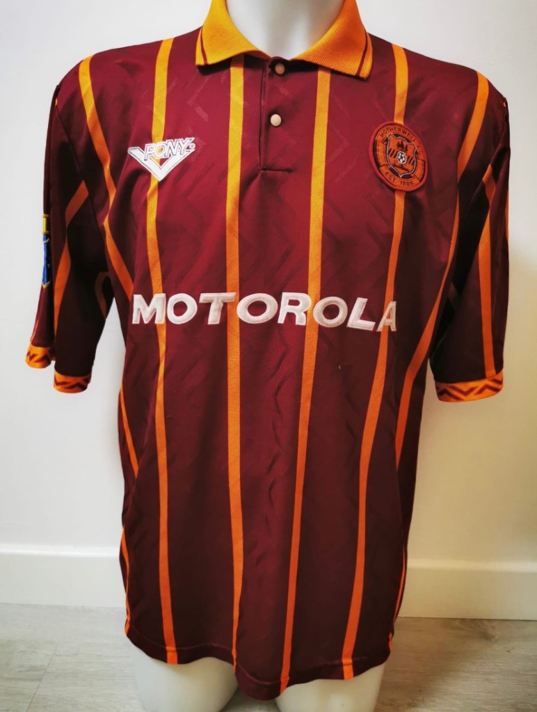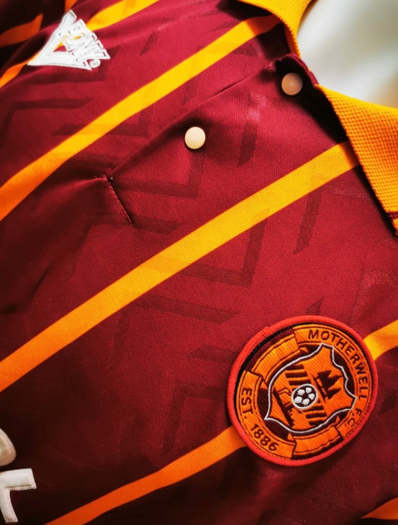 This away top is first of many from the range of jerseys Pony produced between 1994 to 1998. Taking over from Hummel who made the infamous white and claret tram track away top the season before which is probably my favourite Motherwell top of all time and deserves more credit than it’s due as it is not like any other design that I’ve seen on a football top never mind Motherwell.