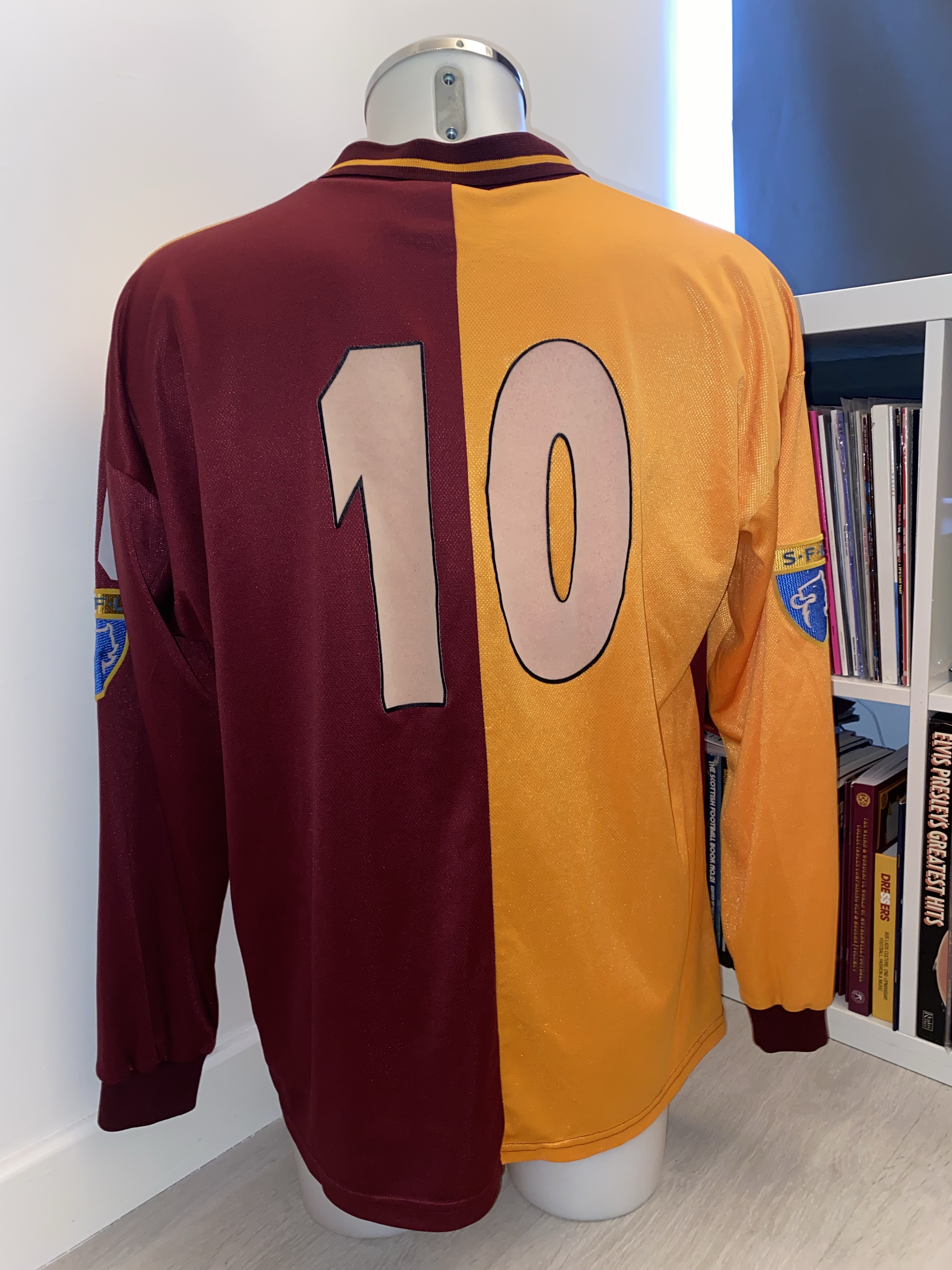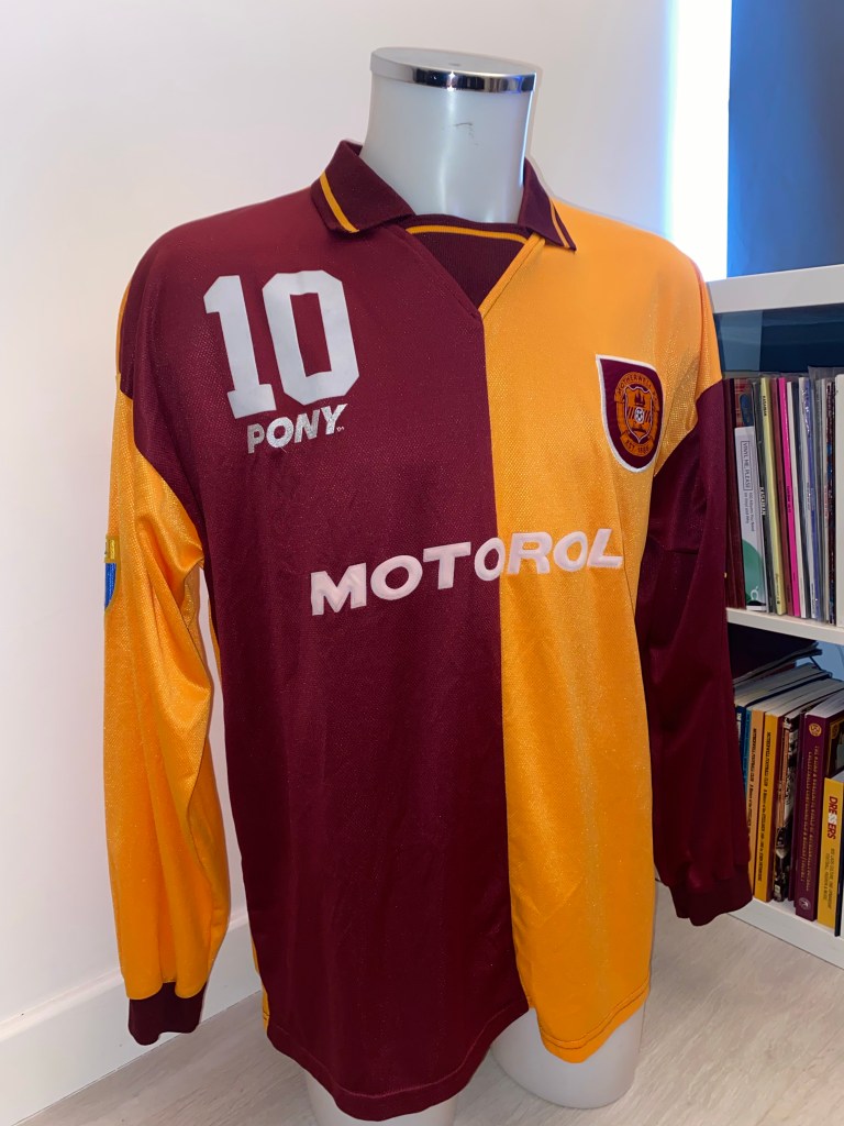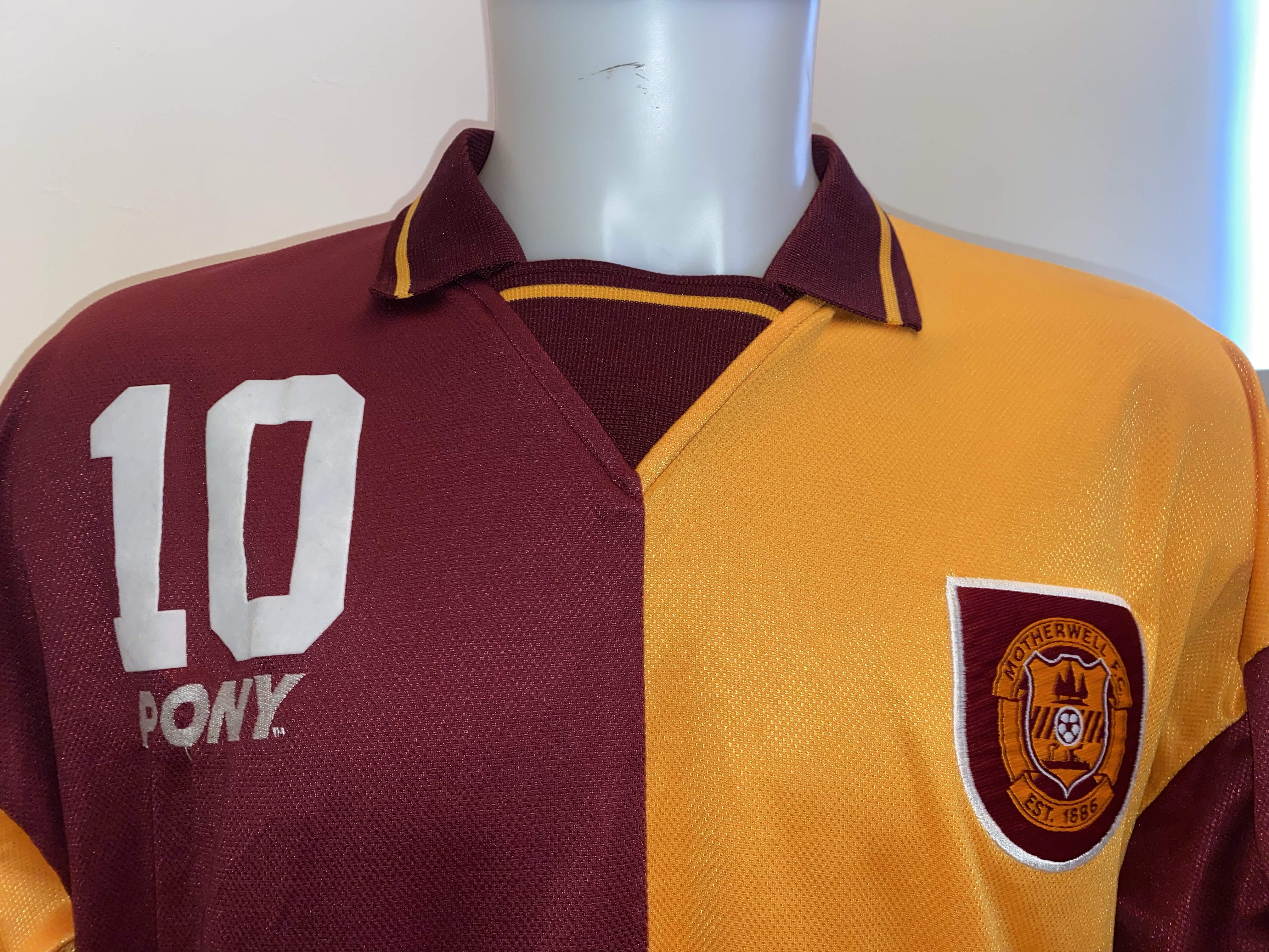 The 96/98 home strip is the last home top in Motherwell’s time with Pony and they certainly left with a bang. Still seen as quite controversial as it isn’t your average home kit but I love this top as the design is just so different from any other home top produced by Motherwell down to the “jester” style of the kit with the half and half colour scheme.