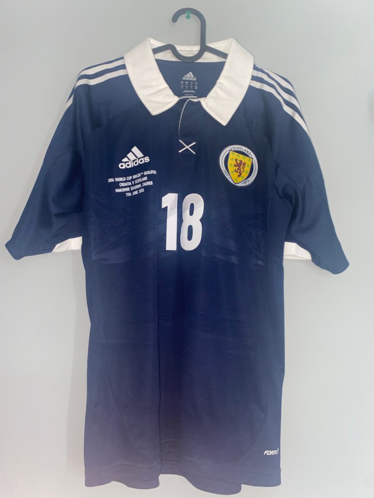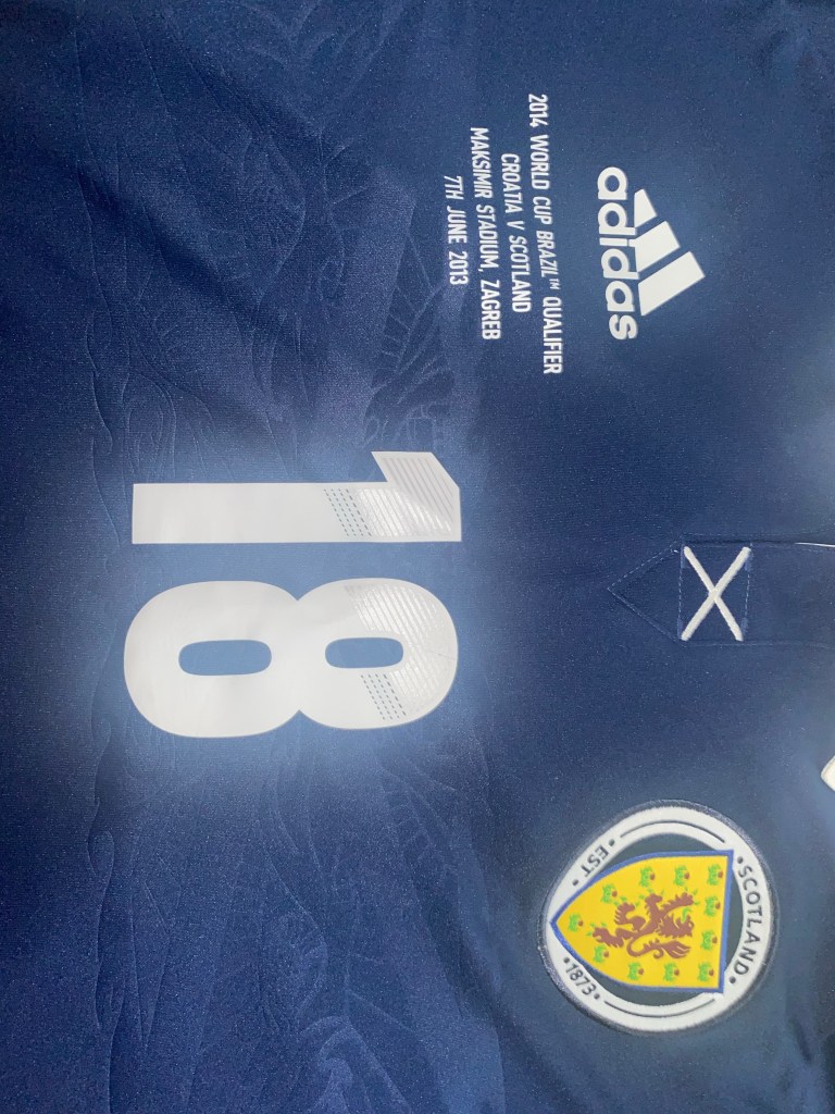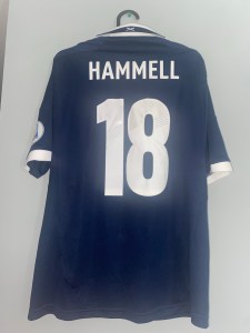 Hammell made just one appearance for Scotland way back in 2004, in a 4-1 defeat to Sweden, but would get his second call up in the summer of 2013 for games against Croatia and England. This jersey featured is from the Croatia game where Hammell would unfortunately not see any game time but still done enough in training to warrant another call up the following October. Hammell would also play 12 times for Scotland under-21’s and twice for Scotland B team.